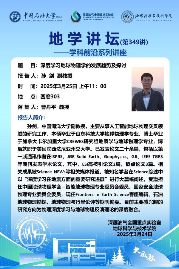 【地学讲坛第349讲】关于 孙剑 副教授《深度学习地球物理学的发展趋势及探讨》学术报告的通知