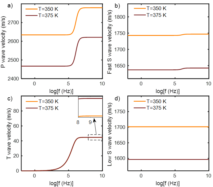 图1.在相同垂直单轴预压和热导率时,350 K和375 K下,弹性波速度随频率的变化。(a)快P波;(b)快S波;(c)T波;(d)慢S波
