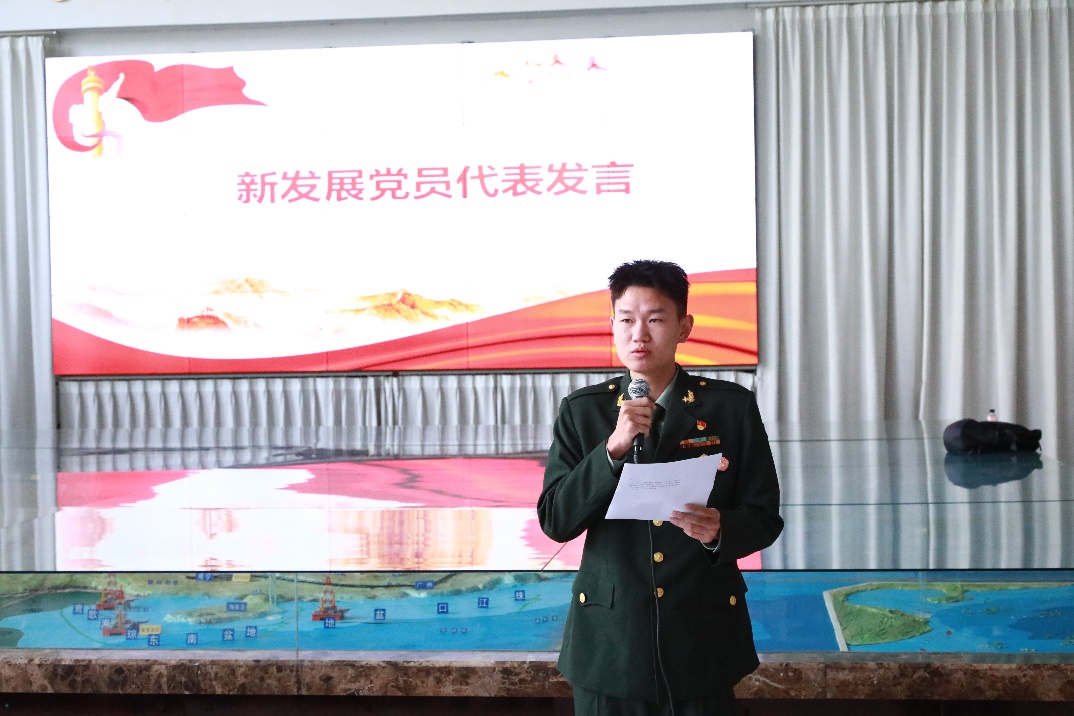 新发展党员代表孙浩楠是一名褪下军装、重返校园的退役老员工,在部队发扬不怕苦、不怕死的精神,被选拔执行国家级重大任务,圆满完成任务。回到学校后坚持“退伍不褪色”,努力学习、团结同学,志愿服务冲在“最前线”,他表示,要继承和发扬伟大的建党精神,坚守入党初心,以“党员”的担当、“地学人”的坚韧,服务人民,奉献社会,勇攀高峰。