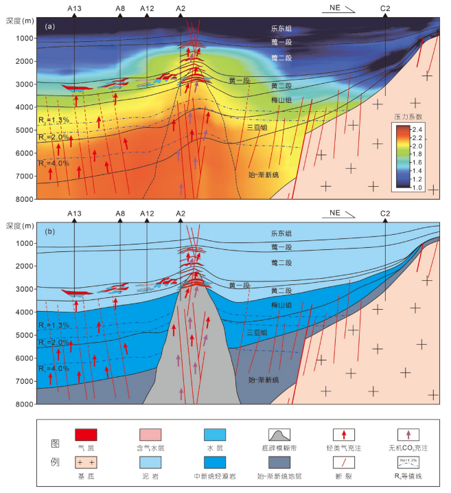 图2. 莺歌海盆地中央坳陷A1-1底辟带超压作为动力的天然气成藏模式