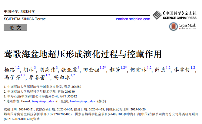 论文信息:杨路, 胡林, 胡高伟, 张亚震, 田金强, 郝芳, 何宗林, 薛岳, 李雪哲, 冯子齐, 李春蕾, 杨白冰. 2025. 莺歌海盆地超压形成演化过程与控藏作用. 中国科学: 地球科学, 55, doi: 10.1360/SSTe-2024-0135