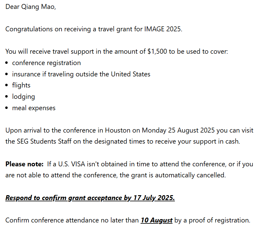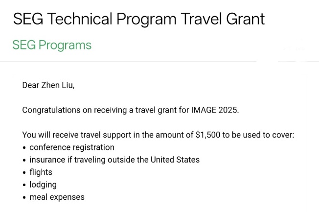 SEG Travel Grant是SEG专门面向全球优秀青年学者设立的专项学术资助项目,具有极高的国际认可度和学术含金量。该奖项每年面向全球所有申请者公开遴选,竞争激烈,获奖比例极低。此次2名博士研究生获奖并受邀参加2025年IMAGE会议,不仅彰显了公司研究生在地球物理领域的学术实力和国际竞争力,也为公司与国际顶尖学会及学者的深入交流与合作搭建了桥梁。
