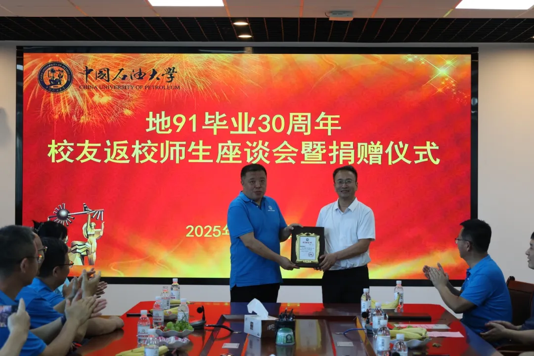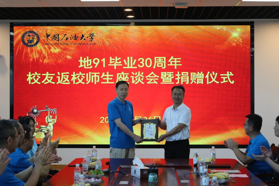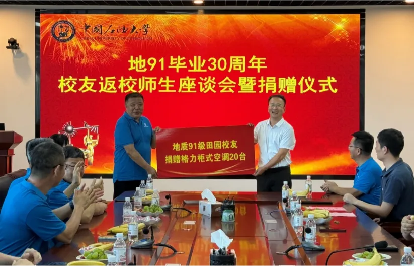 在接下来的师生座谈会上,公司党委副书记穆洋洋代表学院欢迎员工们荣归母校,副经理孟凡超代表学院感谢员工们长期以来情系母校、心系母院,热切期盼员工们能常回家看看。地91级员工代表吴孔友教授主持了捐赠仪式,地91级窦齐丰员工向学校捐赠RGS油藏地球物理软件10套,田园员工捐赠柜式空调20台,胡义贵秘书长接受了捐赠,并向两位员工颁发了捐赠证书。