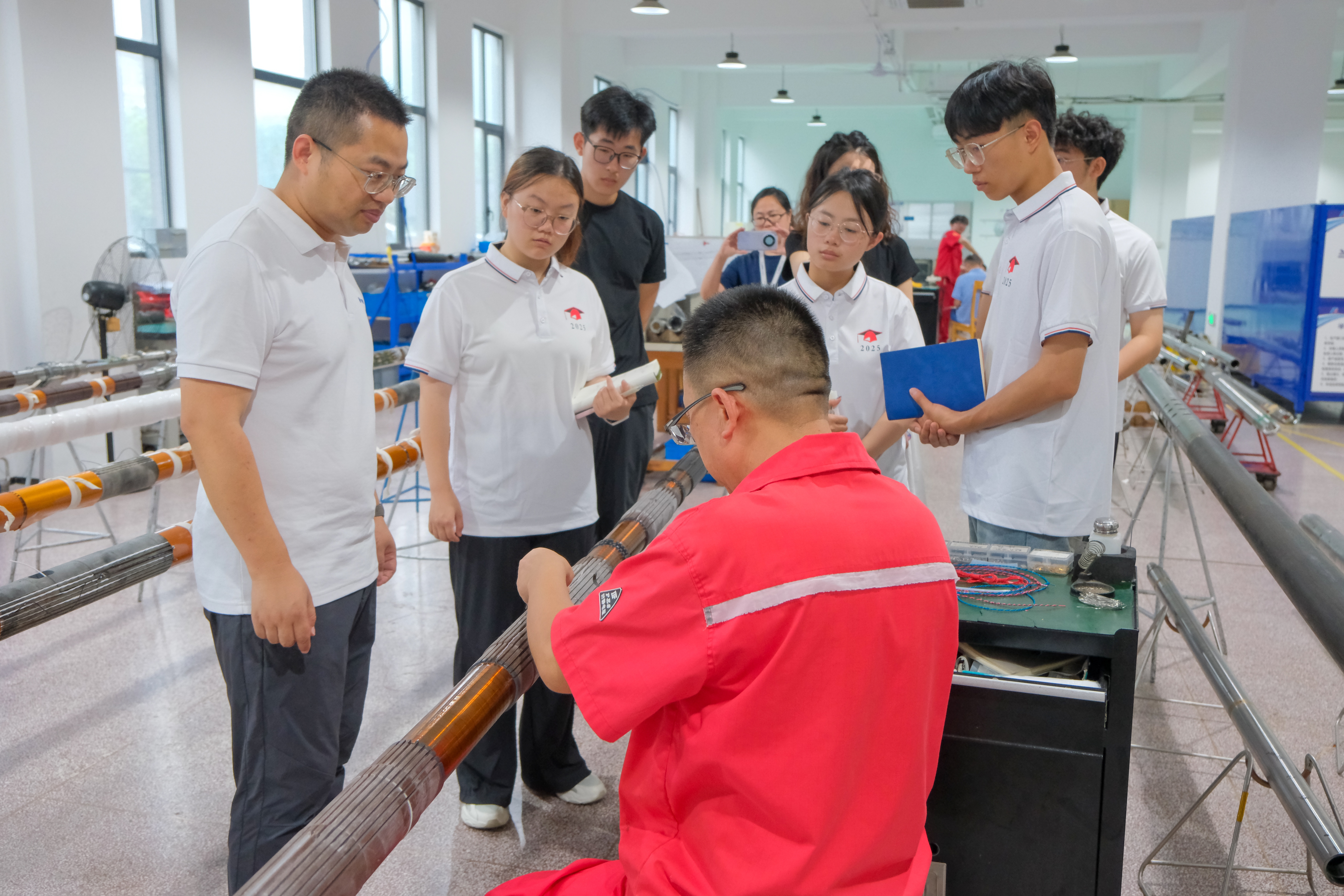 其自主研发的裸眼井、套管井、高温过钻杆等五大类测井仪器,已实现规模化应用,覆盖全国主要油田并出口海外,还参与了塔科一井、川科一井两大万米深井测井任务。交流中,公司首席工程师围绕仪器可靠性提升,介绍可控氧化表面处理技术,通过特殊工艺形成致密氧化层,助力电极适应高温高压井况。在无磁实验室,技术人员详解玻纤增强混凝土建筑结构优势——消除铁磁干扰,保障传感器标定环境磁场强度达标,为测井数据精度筑牢基础,让实践团直观触摸到智能装备“芯”制造的硬核实力。