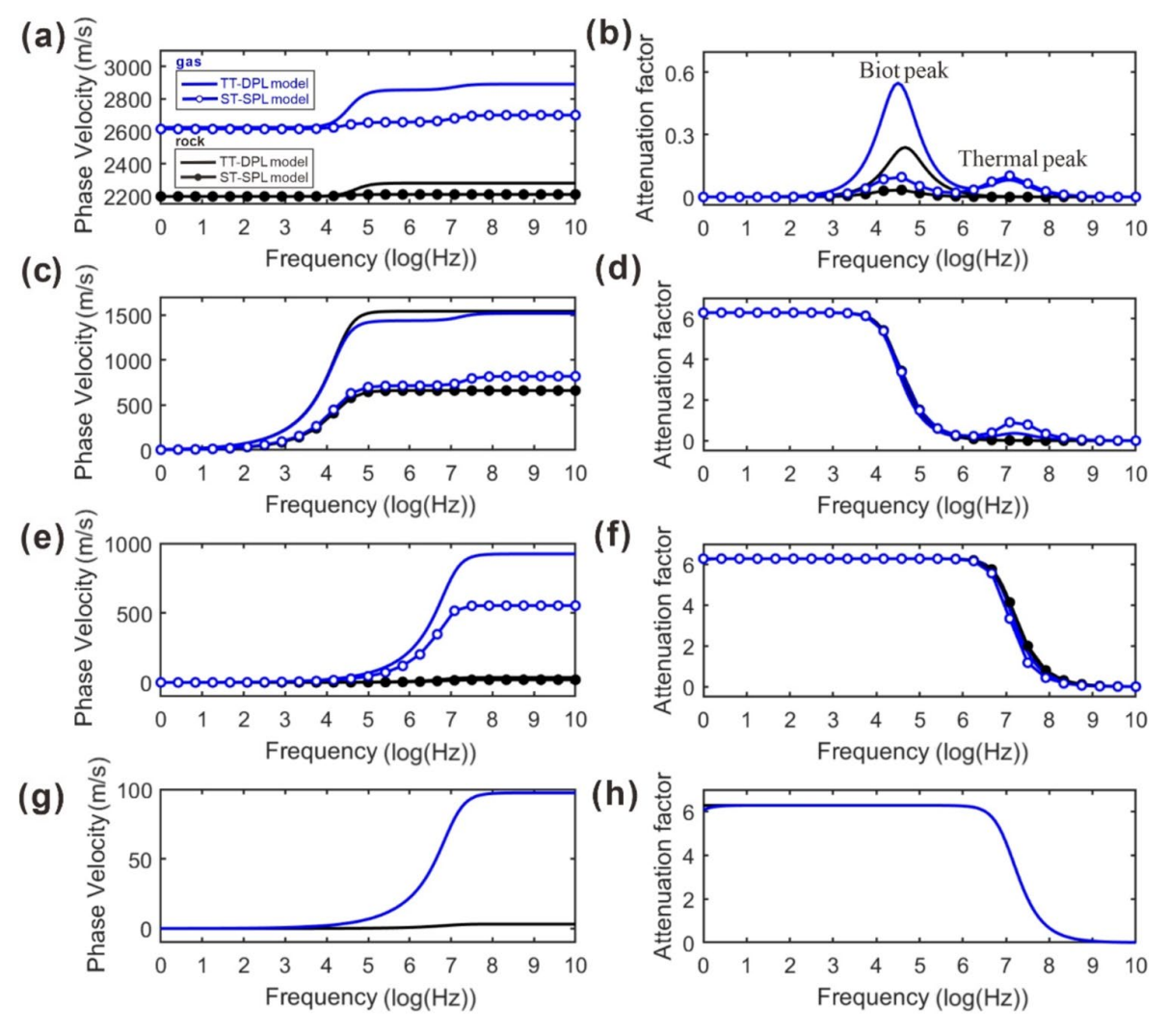 图1.ST-SPL模型与TT-DPL模型预测的弹性波速度随频率的变化。(a)快P波;(b)慢P波;(c)T1波;(d)T2波