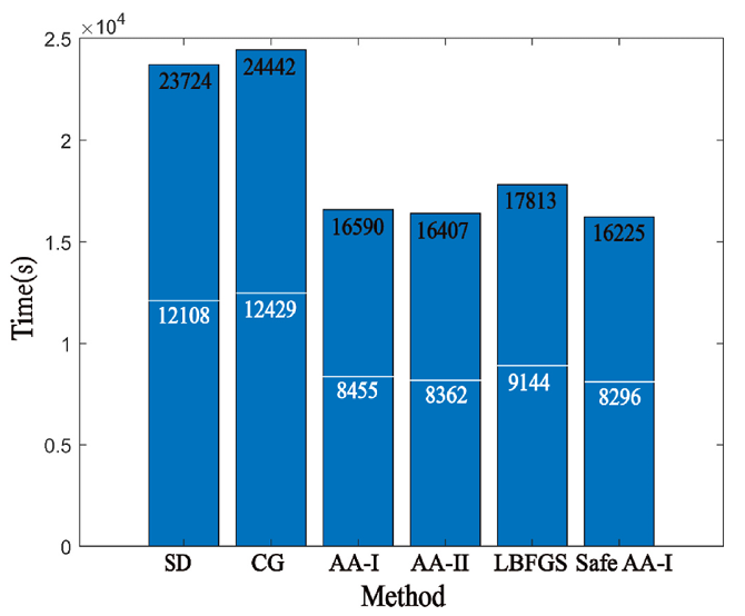 图1. 使用Marmousi模型比较SD、CG、AA-I、AA-II、LBFGS和安全AA-I。(a)为残差收敛曲线对比图,安全的AA-I比其他方法具有更快的收敛速度;(b)为计算成本直方对比图,白色和黑色的时间分别表示LSRTM迭代10次和20次后的计算时间,在这些方法中,安全AA-I花费的计算时间最少