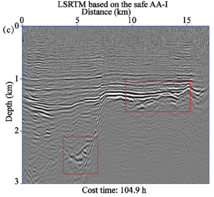 图2. 陆地实际资料成像结果对比。(a)为RTM结果;(b)为基于LBFGS的LSRTM结果;(c)为基于安全AA-I的LSRTM结果