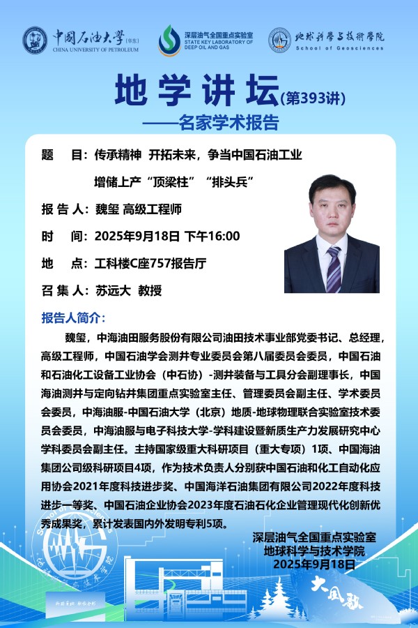 【地学讲坛第393讲】关于魏玺高级工程师《传承精神 开拓未来,争当中国石油工业增储上产“顶梁柱”“排头兵”》学术报告的通知