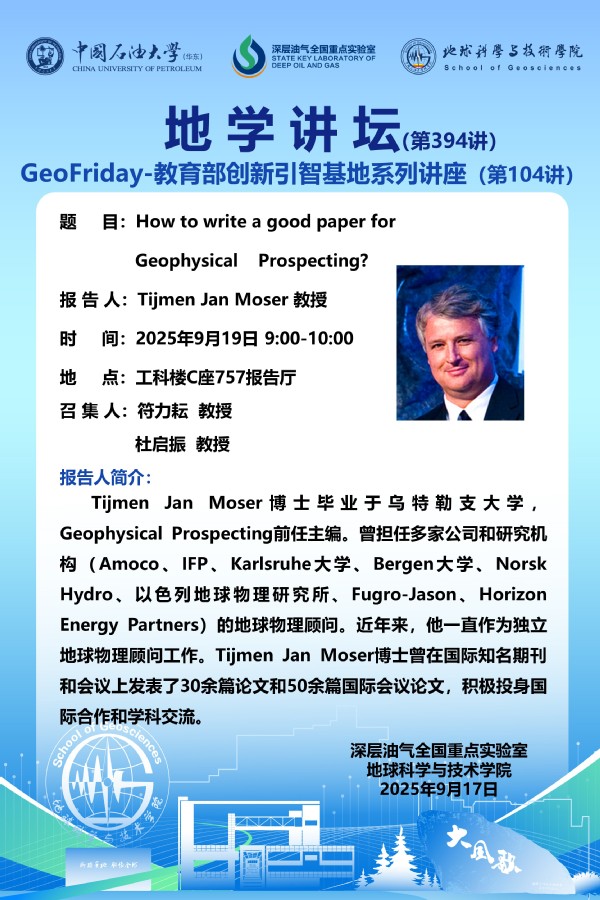 【地学讲坛第394讲】关于Tijmen Jan Moser 教授《How to write a good paper for Geophysical Prospecting》学术报告的通知