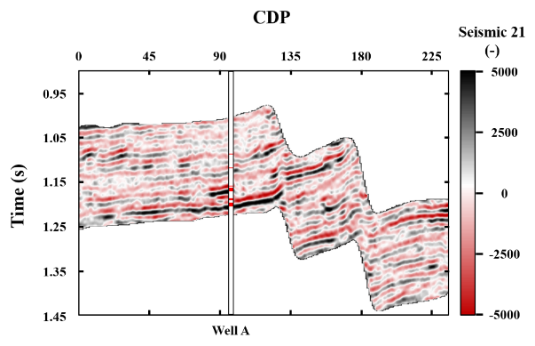 在实际工区数据测试中,我们从中国东部的一个高孔隙度砂岩储层中选取了一个过间剖面来进行实际地震数据的反演。图2展示了在工区内以四个不同入射角度(分别为 12 度、21 度、25 度和 30 度)获取的过井A的地震剖面。该剖面中,有两个主要的高孔隙度含油砂体储层,它们在解释中的红色位置与井 A 相交。
