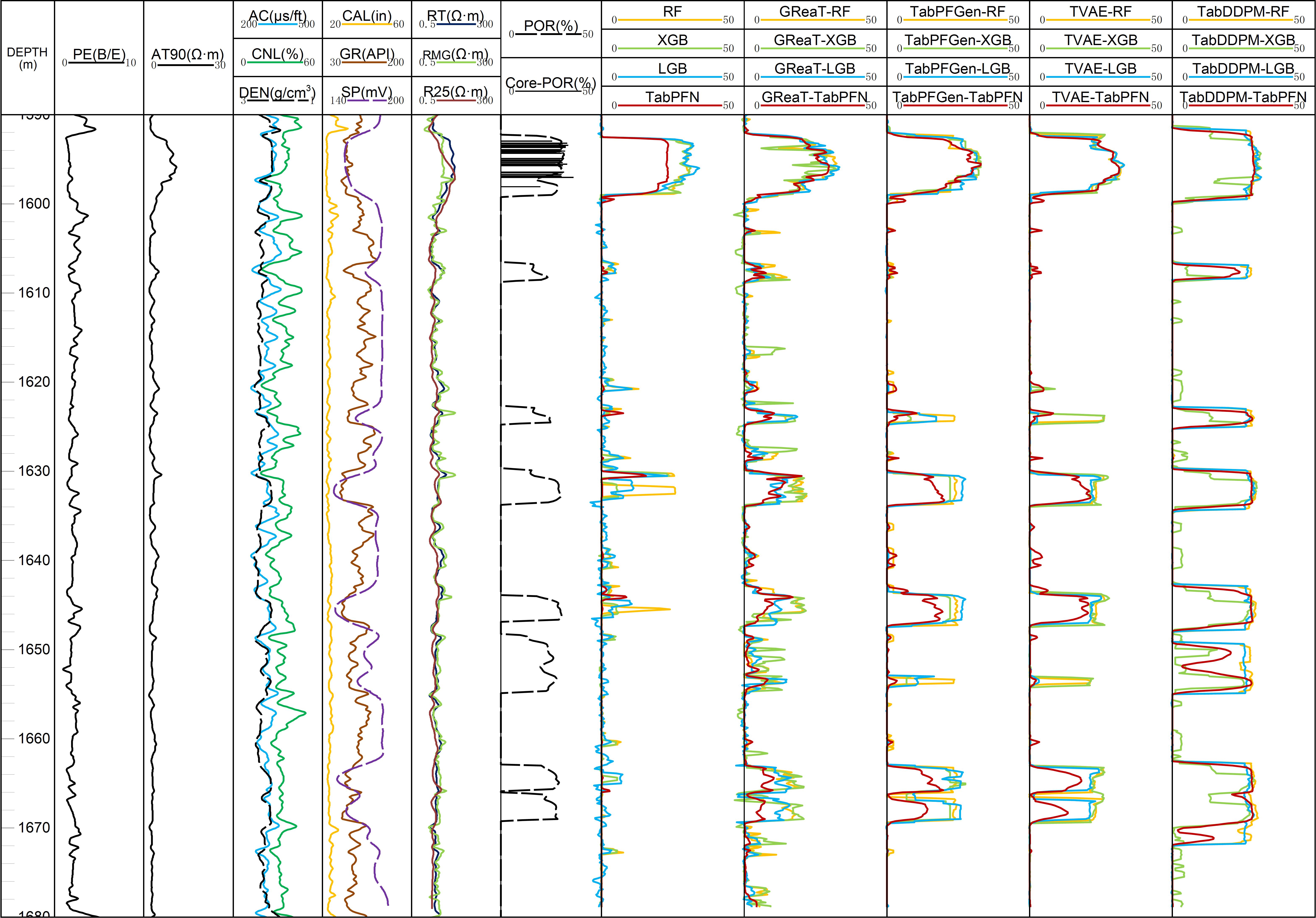 图4 不同岩心数据增强-机器学习模型组合下孔隙度预测结果