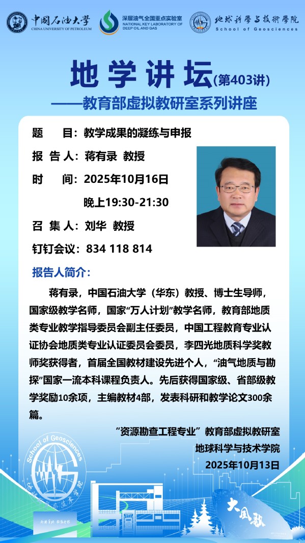 【地学讲坛第403讲】教育部虚拟教研室活动-关于蒋有录教授《教学成果的凝练与申报》讲座的通知