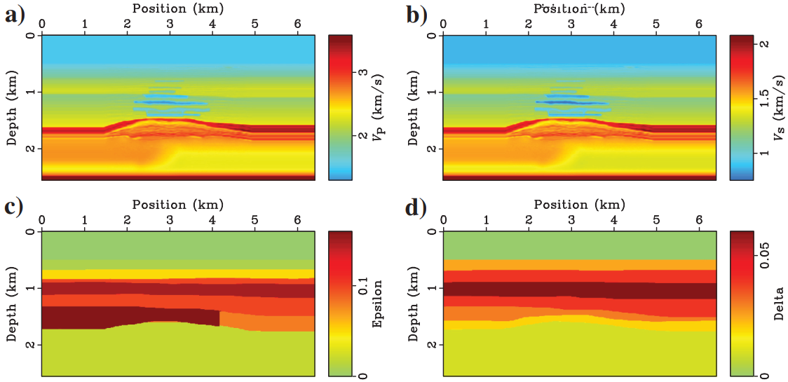 图1. Valhal模型,其中(a)为Vp速度模型,(b)为Vs速度模型,(c)和(d)为各向异性参数
