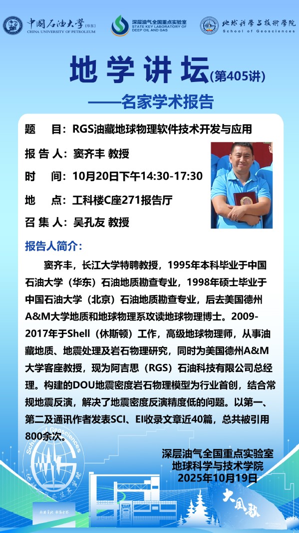 【地学讲坛第405讲】关于窦齐丰 教授《RGS油藏地球物理软件技术开发与应用》学术报告的通知