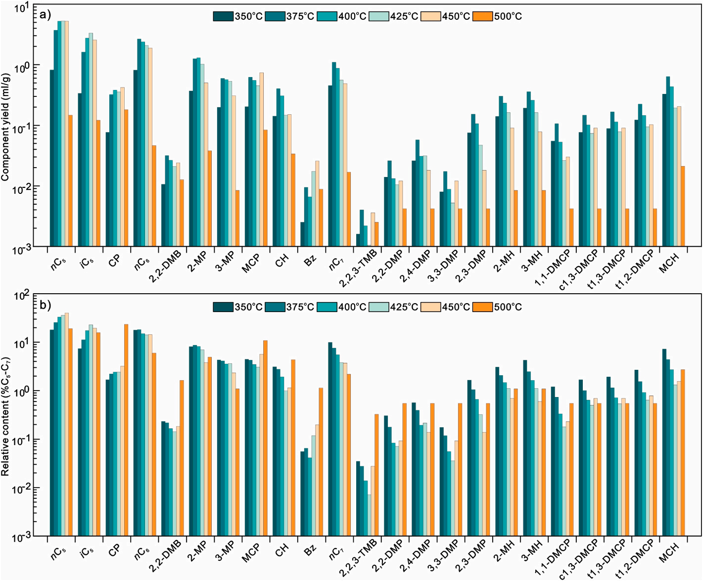 轻烃分子构型复杂,包括了正构烷烃、异构烷烃、环烷烃以及芳香烃类,蕴含了更多的地球化学信息,能够应用于有机物质来源、沉积环境、热成熟度及油气藏次生蚀变作用判识。热裂解作用能够改变轻烃的分布特征,导致相关地球化学指标发生严重蚀变。本研究对塔里木盆地奥陶系的海相原油及其石灰岩储层岩石碎屑进行了封闭体系高温(350-500 °C)和高压(60 MPa)共热实验。随后对热解气中的轻烃进行了定性定量分析,结合C1-C4化合物及其同位素组成,探讨了热裂解过程中轻烃的演化特征(图1),评估了轻烃对热裂解气成因的诊断潜力(图2),探索了评估热成熟度和热裂解强度的新指标。在此基础上,结合对塔里木盆地和四川盆地深层古生界天然气以及四川盆地页岩气样品(图3),展示了该研究的实际应用价值。