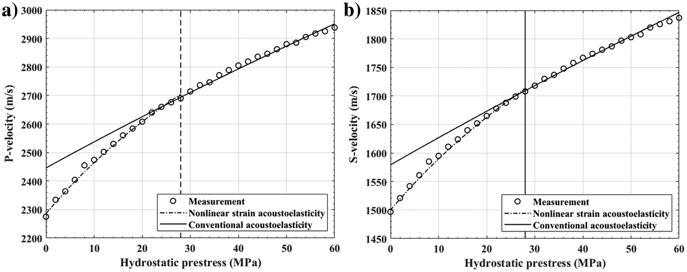 图2. P波速度(a)与S波速度(b)与静水压力的变化关系。圆点表示实测值,实线表示传统声弹性理论的预测,点划线表示引入非线性应变声弹性后的预测,竖直虚线表示分段点
