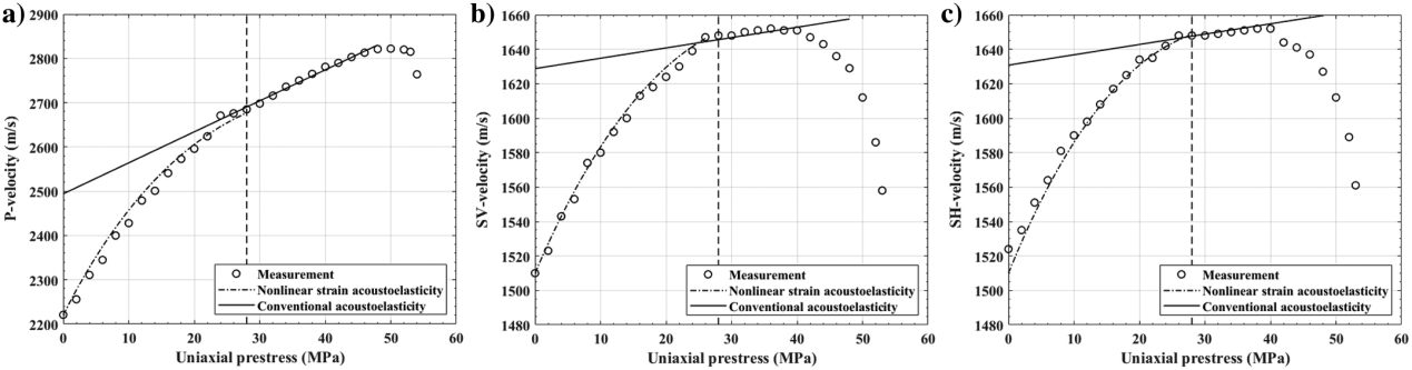图3. P波速度(a)、SV波速度(b)和SH波速度(c)随单轴压力的变化关系。圆点表示实测数据,实线表示传统声弹性理论的预测,点划线表示引入非线性应变声弹性后的预测,竖直虚线表示分段点