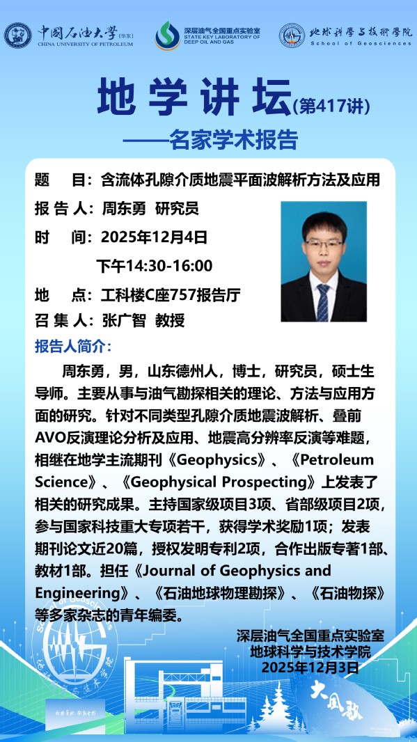 【地学讲坛第417讲】关于周东勇研究员《含流体孔隙介质地震平面波解析方法及应用》学术报告的通知