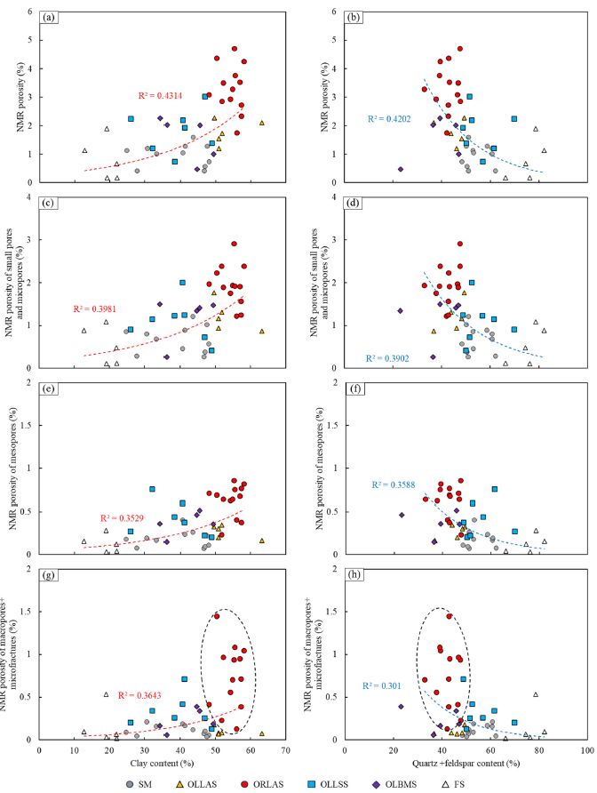 图3 黏土含量与孔隙度(a)、长英质矿物含量与孔隙度(b)、黏土含量与小孔及微孔核磁共振孔隙度(c)、长英质矿物含量与小孔及微孔核磁共振孔隙度(d)、长英质矿物含量与中孔核磁共振孔隙度(e)、长英质矿物含量与中孔核磁共振孔隙度(f)、黏土含量与大孔+微裂隙核磁共振孔隙度(g)、长英质矿物含量与大孔+微裂隙核磁共振孔隙度(h)之间的关系
