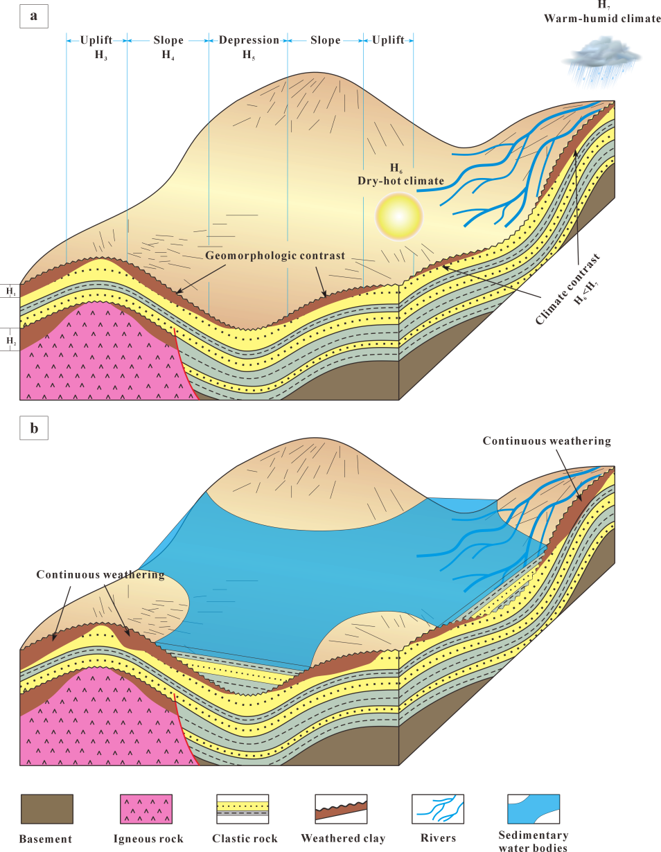 图2.多因素控制下风化黏土层发育演化模式图