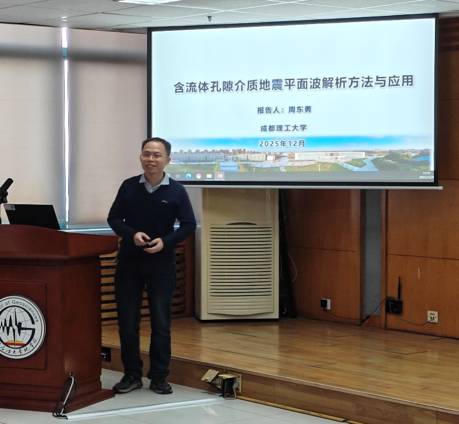 2025年12月4日下午,地学讲坛第417讲在工科C757成功举行,讲座由张广智教授召集并主持,成都理工大学地球物理学院周东勇应邀作《含流体孔隙介质地震平面波解析方法及应用》的学术报告,吸引了众多师生及科研人员参与。