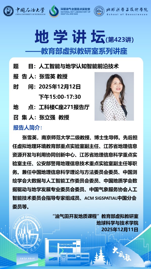 【地学讲坛第423讲】教育部虚拟教研室活动-关于张雪英教授《人工智能与地学认知智能前沿技术》讲座的通知