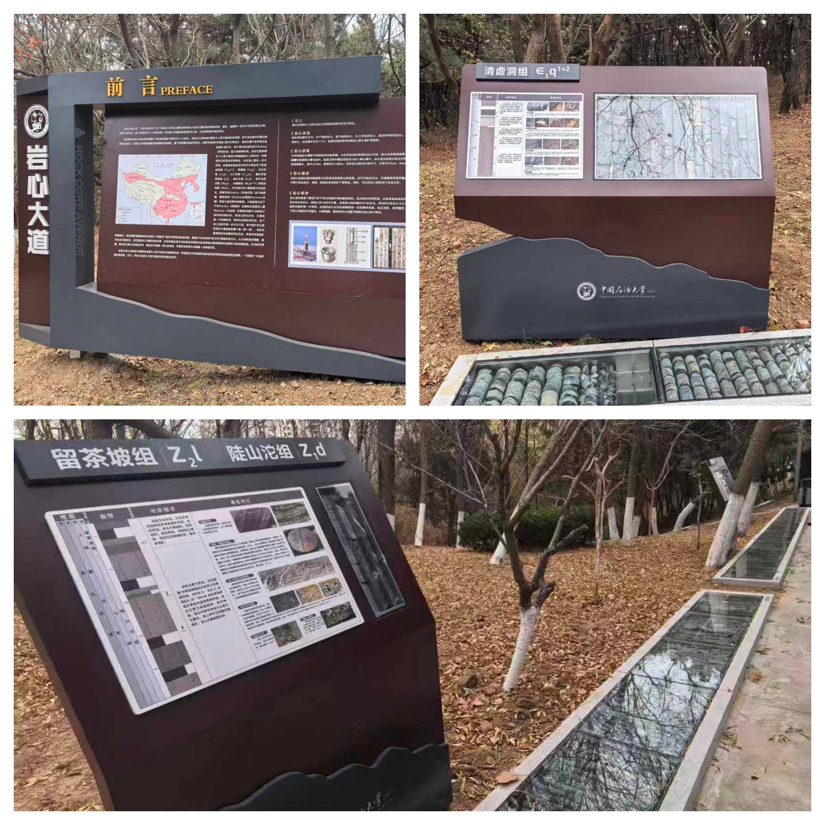 岩心大道作为二期建设的核心景观与科教走廊,依托小黄山原有道路改造提升,集中展示了公司94级员工朱光有教授捐赠的下古生界寒武系至上元古界南华系连续1400米长的钻井岩心样本。通过在主干道一侧建成岩心实物展示区,真实还原岩心各个深度的真实样貌,全面展示我国南方上扬子地区上元古界——下古生界地层的演变;通过建设文化展示墙,对典型层段岩心特征进行详解介绍,使师生在漫步中直观感受地下岩层的实际特点及其演变历史。大道不仅成为校园一道独特的风景线,更化身“行走的地质课堂”,助力学校地学人才培养与学科文化传播。